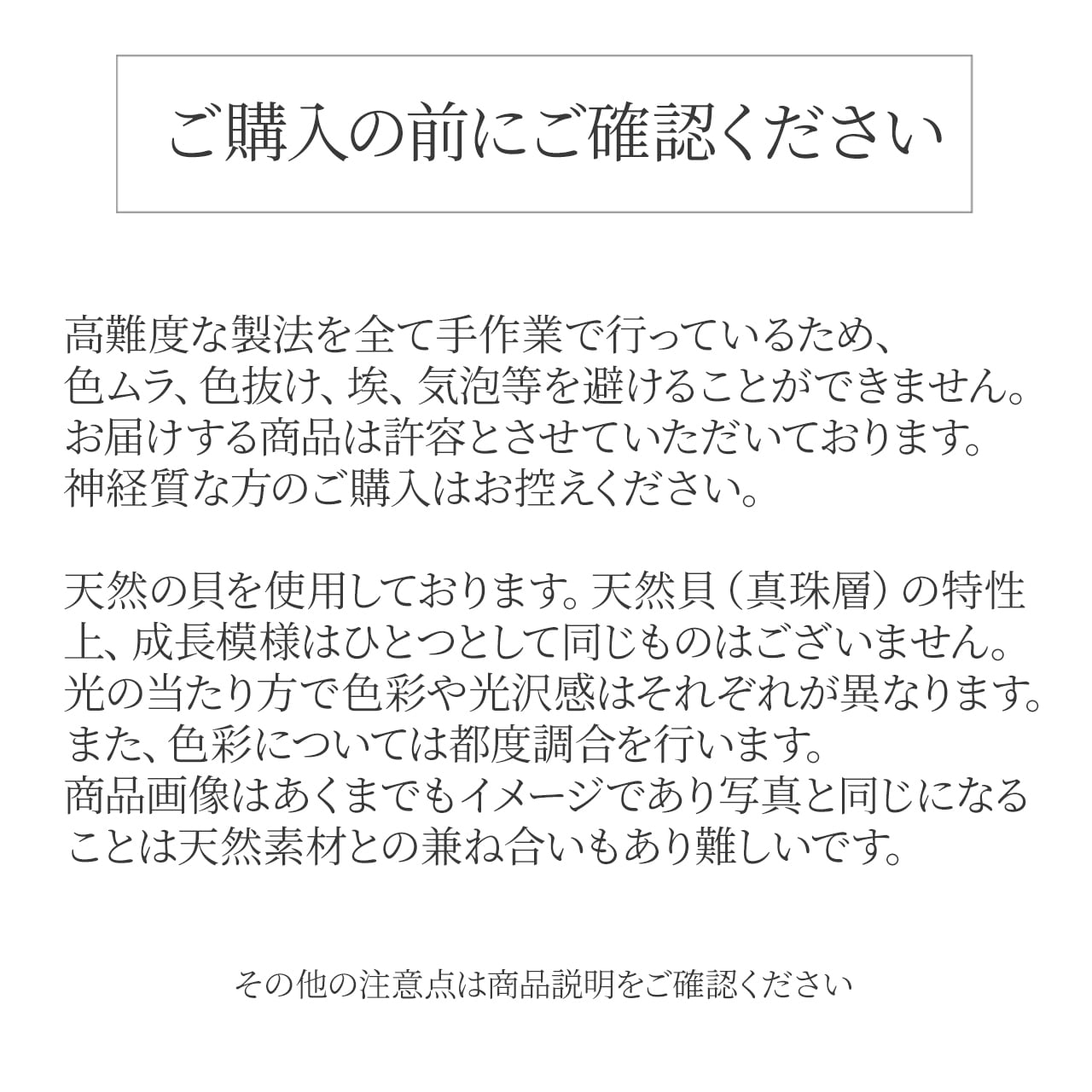 ・天然の貝を使用しております。天然貝(真珠層)の特性上、成長模様はひとつとして同じものはございません。光の当たり方で色彩や光沢感はそれぞれが異なります。同じデザインであっても同じものは二つと作れないのがオンリーワンという魅力でもございます。