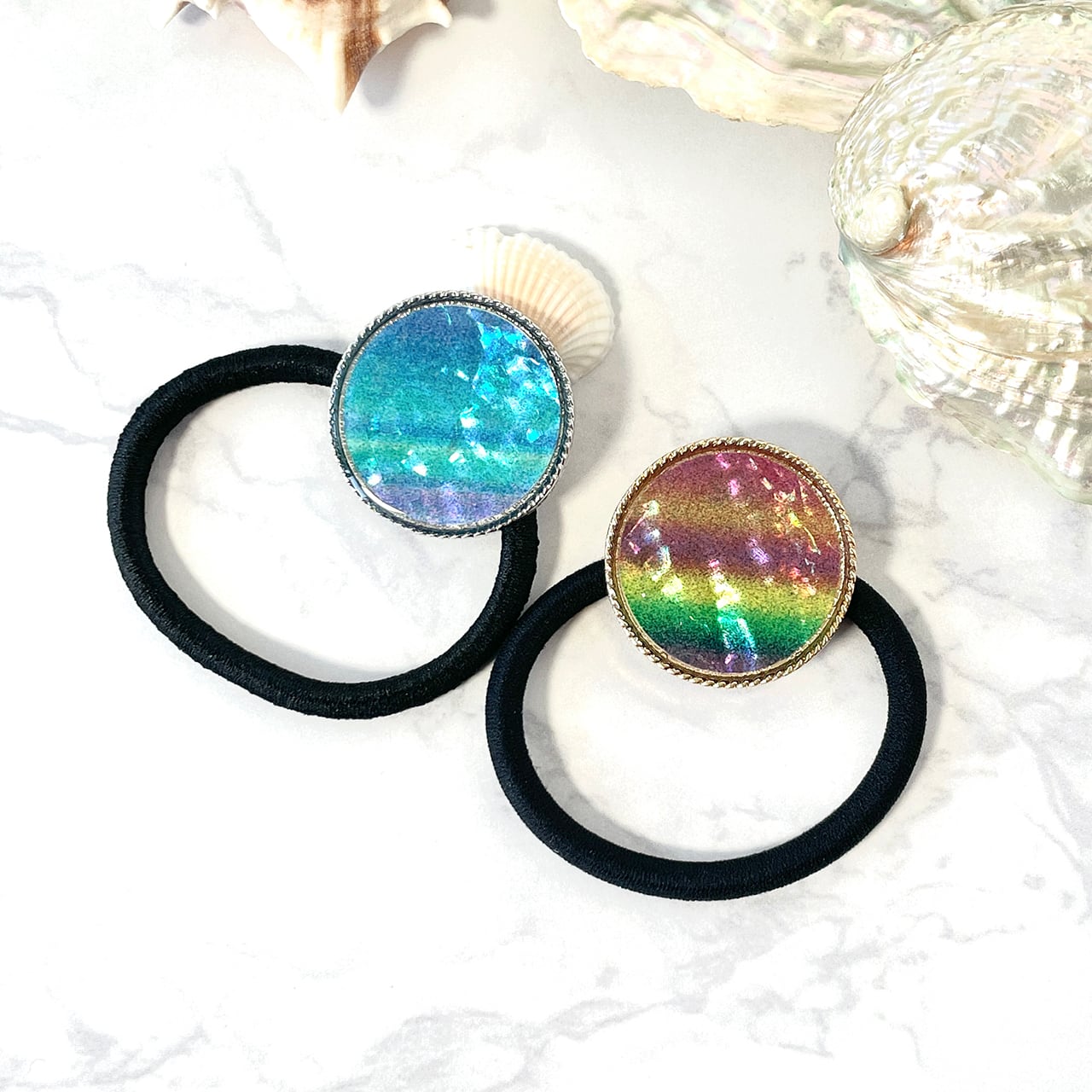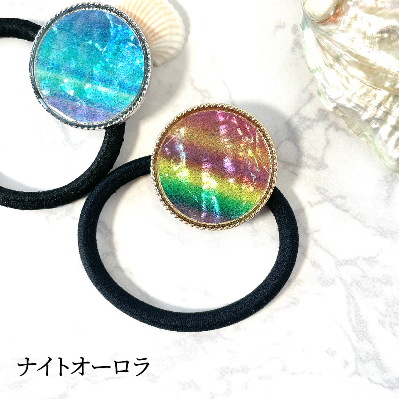 天然貝 ヘアゴム( ディープシー/ナイトオーロラ)簡単可愛いまとめ髪に ★ シェル ・ 螺鈿アート ヘアアクセサリー