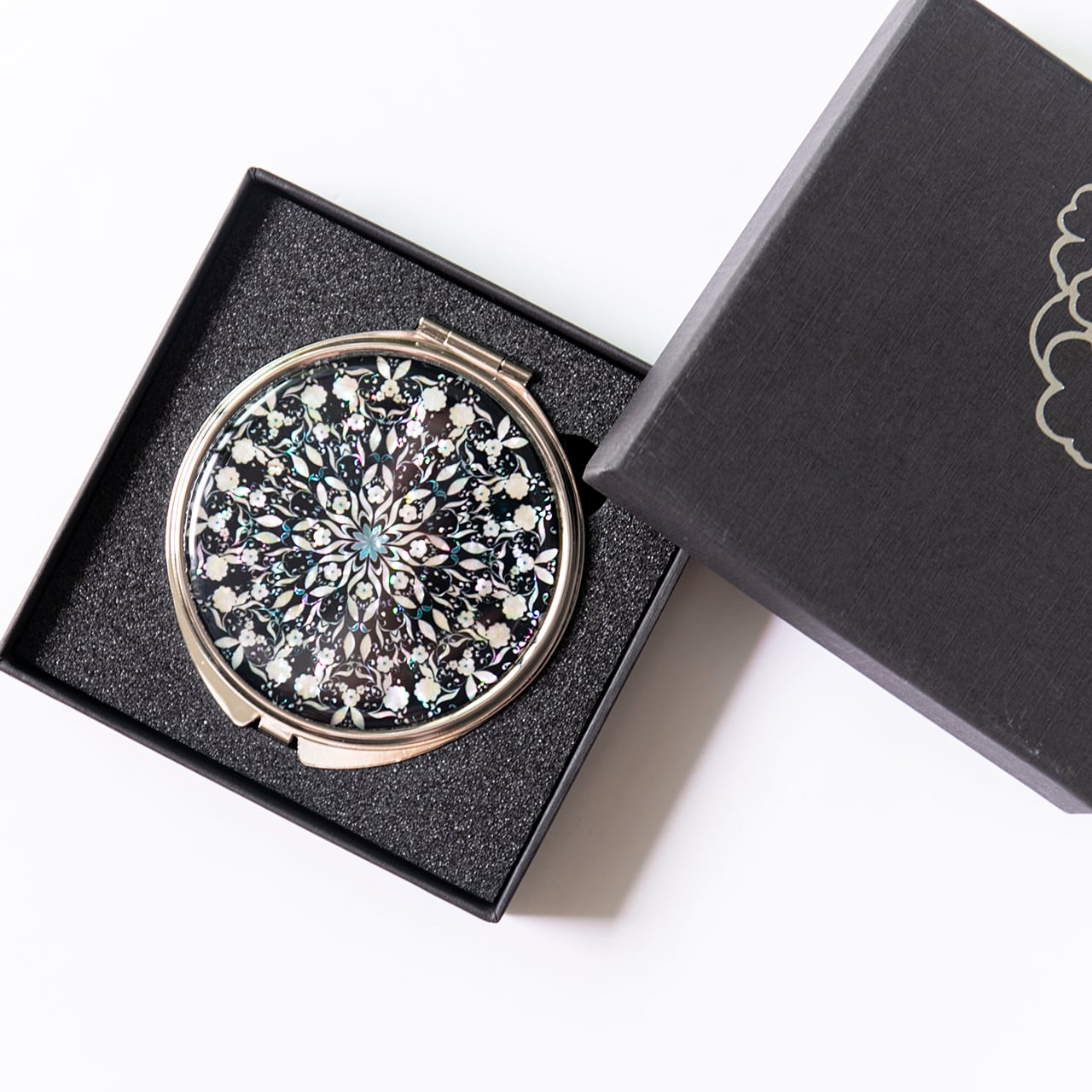 天然貝 コンパクトミラー(フラワーファンタジー・ブラック)シェル・螺鈿アート|プレゼント・ギフトにおすすめ
