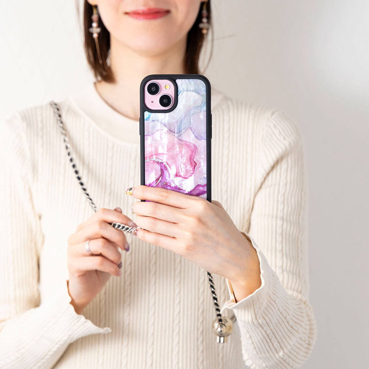 【 スマホショルダー 】天然貝 螺鈿アート シェル ★ マーブル・モード/マーブル・スウィート(ハイクオリティケース/チェーン付き)| iPhone 13 / 14 / 15 / 16 対応
