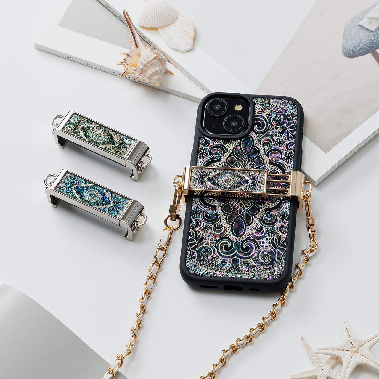 天然貝螺鈿アート★バッククリップ・スマホクリップ|スマホを挟むだけでショルダーへ(エイシェントイスタンブール・アクア/アース/ヴァイオレット)